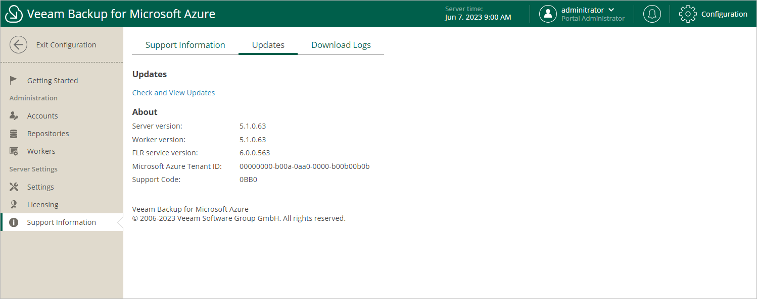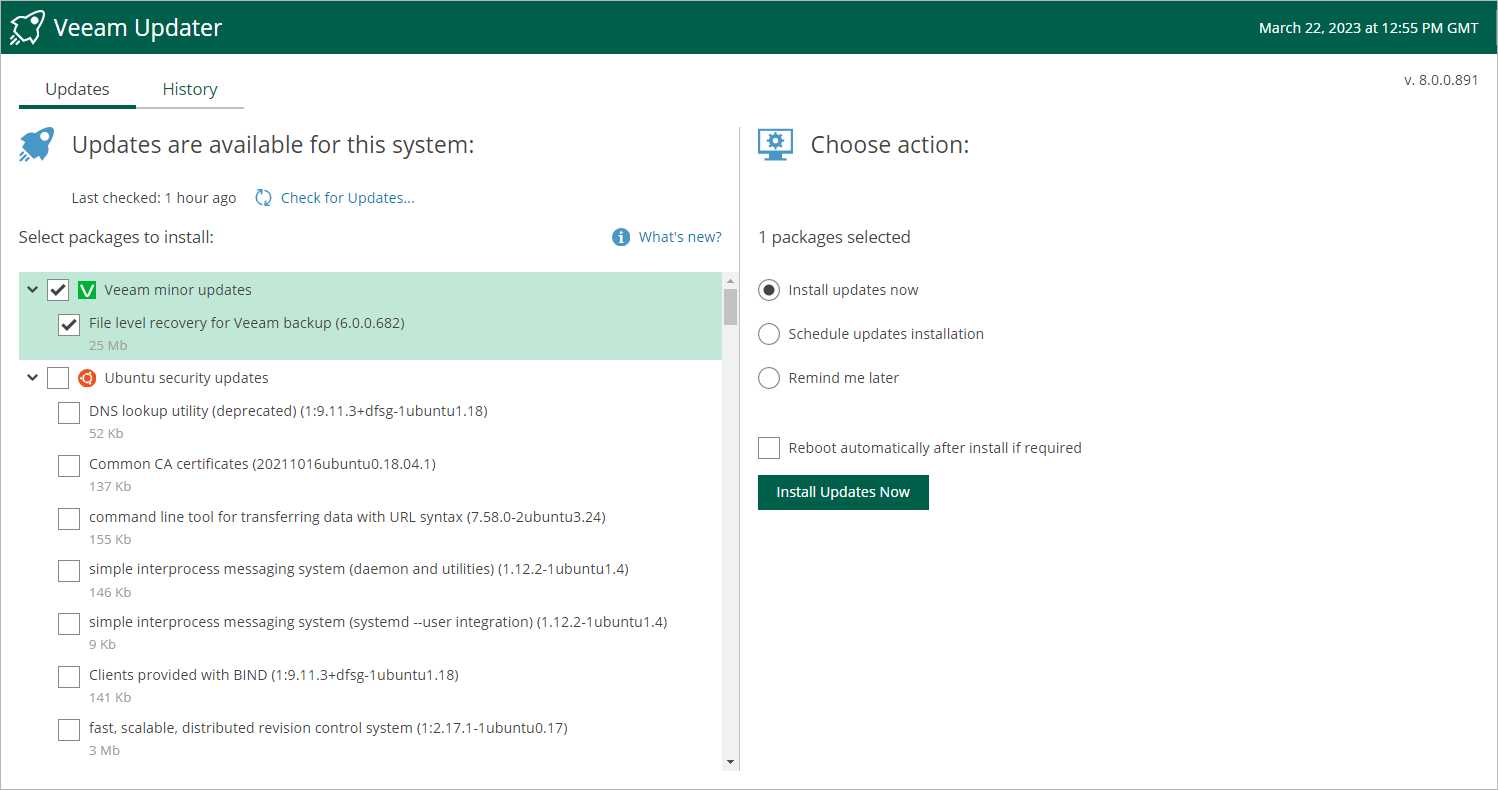 Veeam Backup for Microsoft Azure automatically notifies you about newly released product versions and package updates available for the operating system running on the backup appliance. However, you can check for the available updates manually if required:
