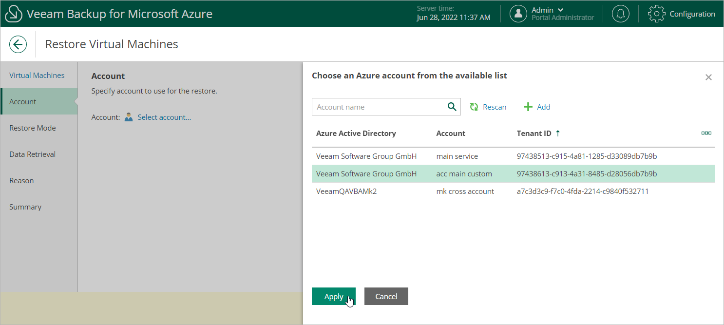 At the Account step of the wizard, select an Azure account whose permissions Veeam Backup for Microsoft Azure will use to perform the restore operation.