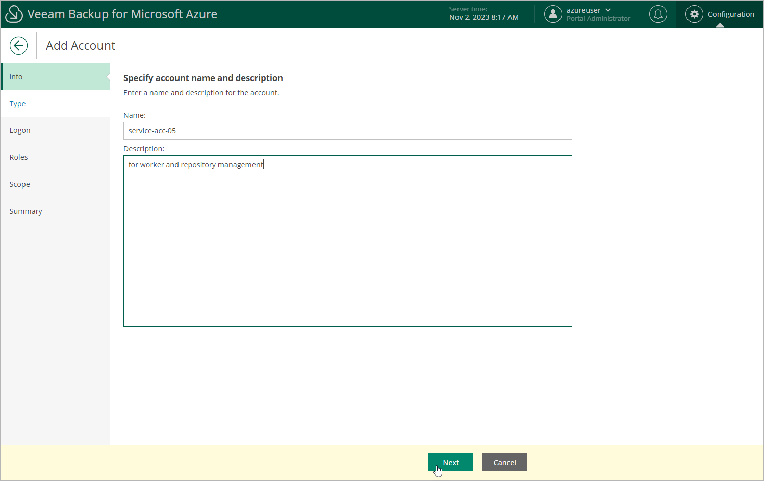 At the Info step of the wizard, use the Name and Description fields to enter a name for the new account and to provide a description for future reference.
