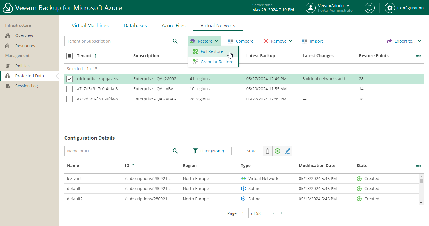 2. Select the configuration record for an Azure subscription whose virtual network configuration you want to restore.