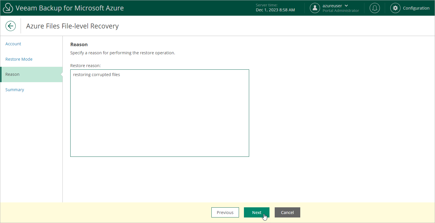 At the Reason step of the wizard, specify a reason for restoring files and folders. This information will be saved to the session history, and you will be able to reference it later.
