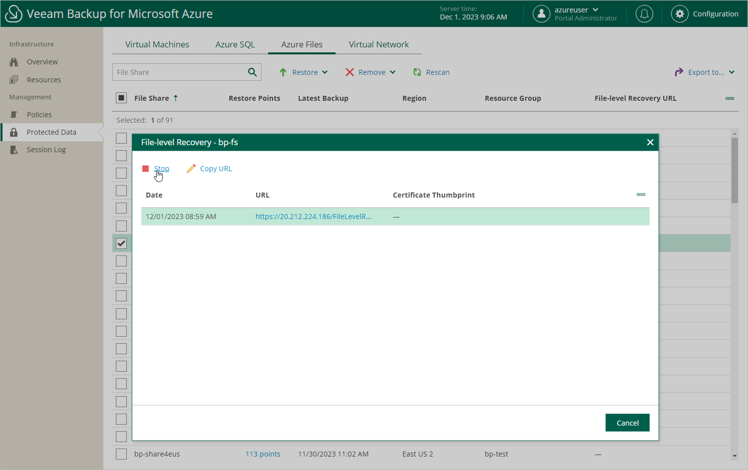 After you finish working with the file-level recovery browser, it is recommended that you stop the restore session. To do that, click Stop in the File-level Recovery window. If you do not perform any actions in the file-level recovery browser for 30 minutes, and if no files are being restored, Veeam Backup for Microsoft Azure will stop the restore session automatically.