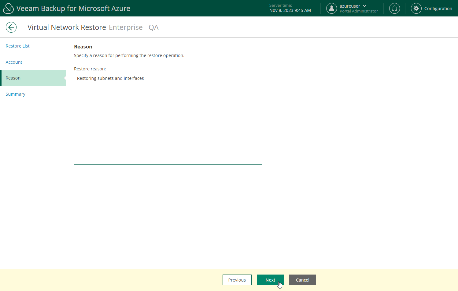 At the Reason step of the wizard, specify a reason for the restore of virtual network configuration items. The information you provide will be saved in the session history and you can reference it later.