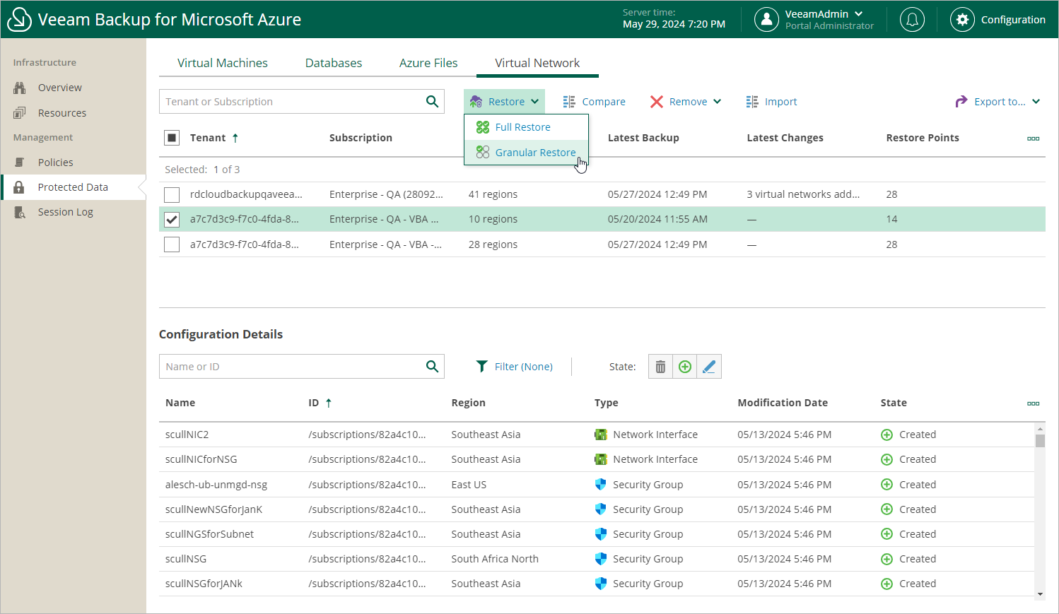 This is an archive version of the document. To get the most up-to-date information, see the current version. Step 1. Launch Virtual Network Restore Wizard To launch the Virtual Network Restore wizard, do the following:Navigate to Protected Data > Virtual Network.Select the configuration record for an Azure subscription whose virtual network configuration you want to restore.Click Restore > Granular Restore.