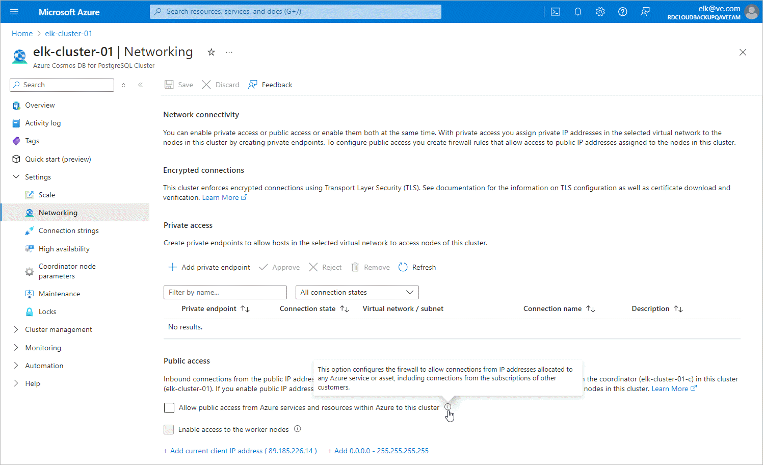 - In the Public access section, make sure the Allow public access from Azure services and resources within Azure to this cluster check box is not selected.