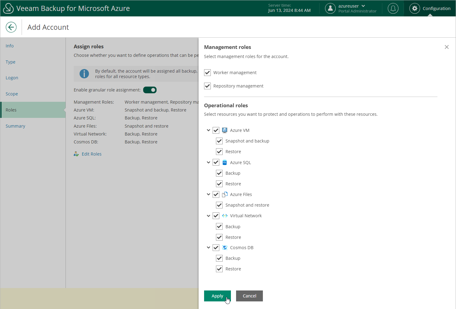 At the Roles step of the wizard, you can define specific operations that Veeam Backup for Microsoft Azure will be able to perform using permissions of the service account: