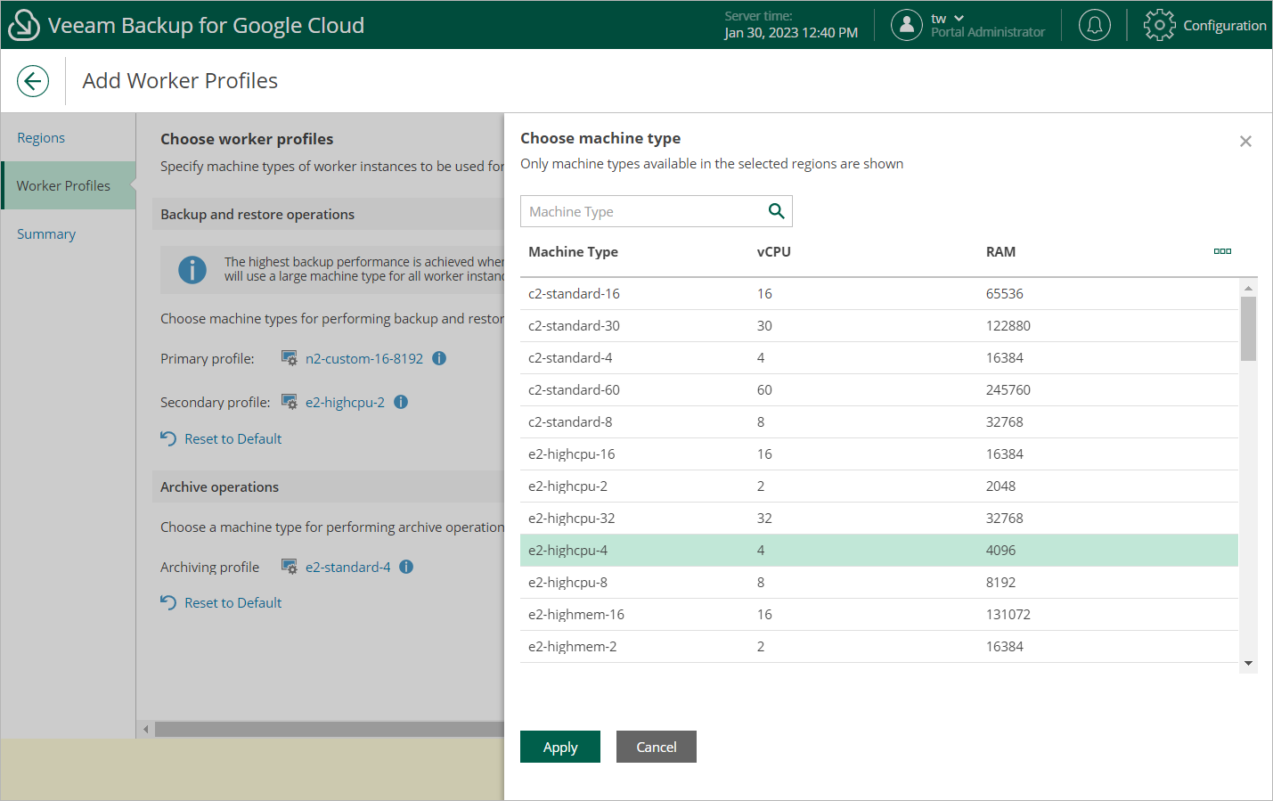 At the Worker Profiles step of the wizard, choose profiles that will be used to deploy workers in the selected regions. To help you choose, tables in the Choose machine type sections will provide information on the number of vCPU cores and the amount of system RAM for each available machine type.