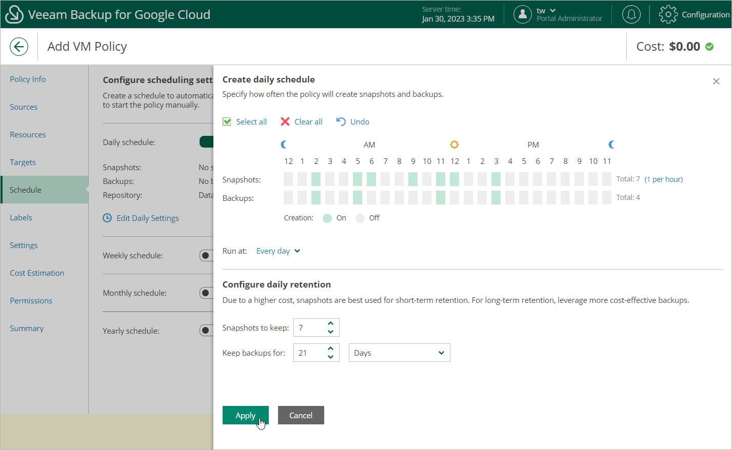Veeam Backup for Google Cloud does not create image-level backups independently from cloud-native snapshots. That is why when you select hours for image-level backups, the same hours are automatically selected for cloud-native snapshots. To learn how Veeam Backup for Google Cloud performs backup, see How Backup Works. |