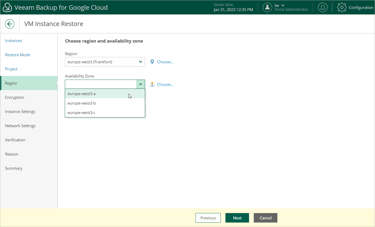 At the Region step of the wizard, select a region where the restored VM instance will operate and an availability zone for which you want to configure network settings.