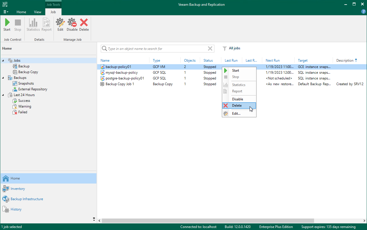 Alternatively, you can right-click the necessary backup policy and select Delete.