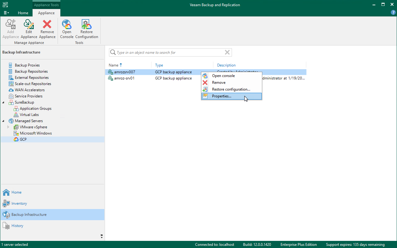 - Select the necessary Veeam Backup for Google Cloud appliance and click Edit Appliance on the ribbon.