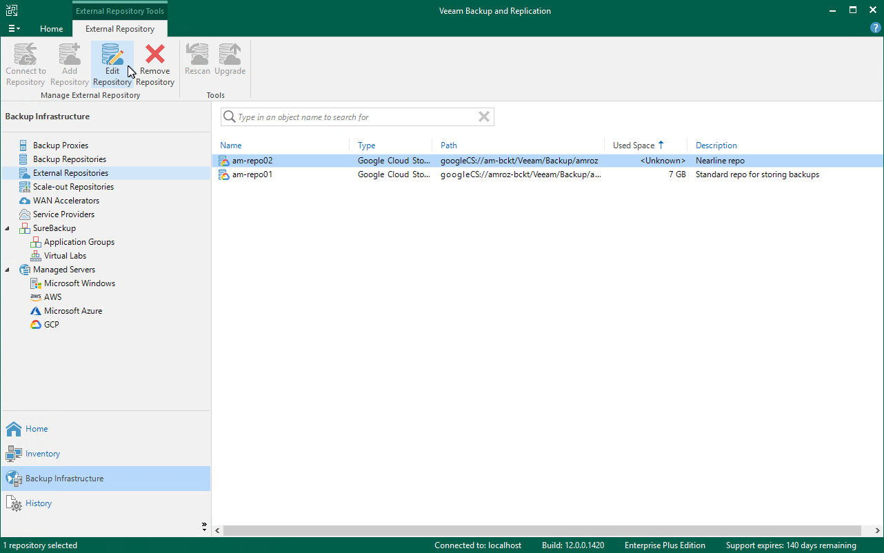 - Select the necessary repository and click Edit Repository on the ribbon.