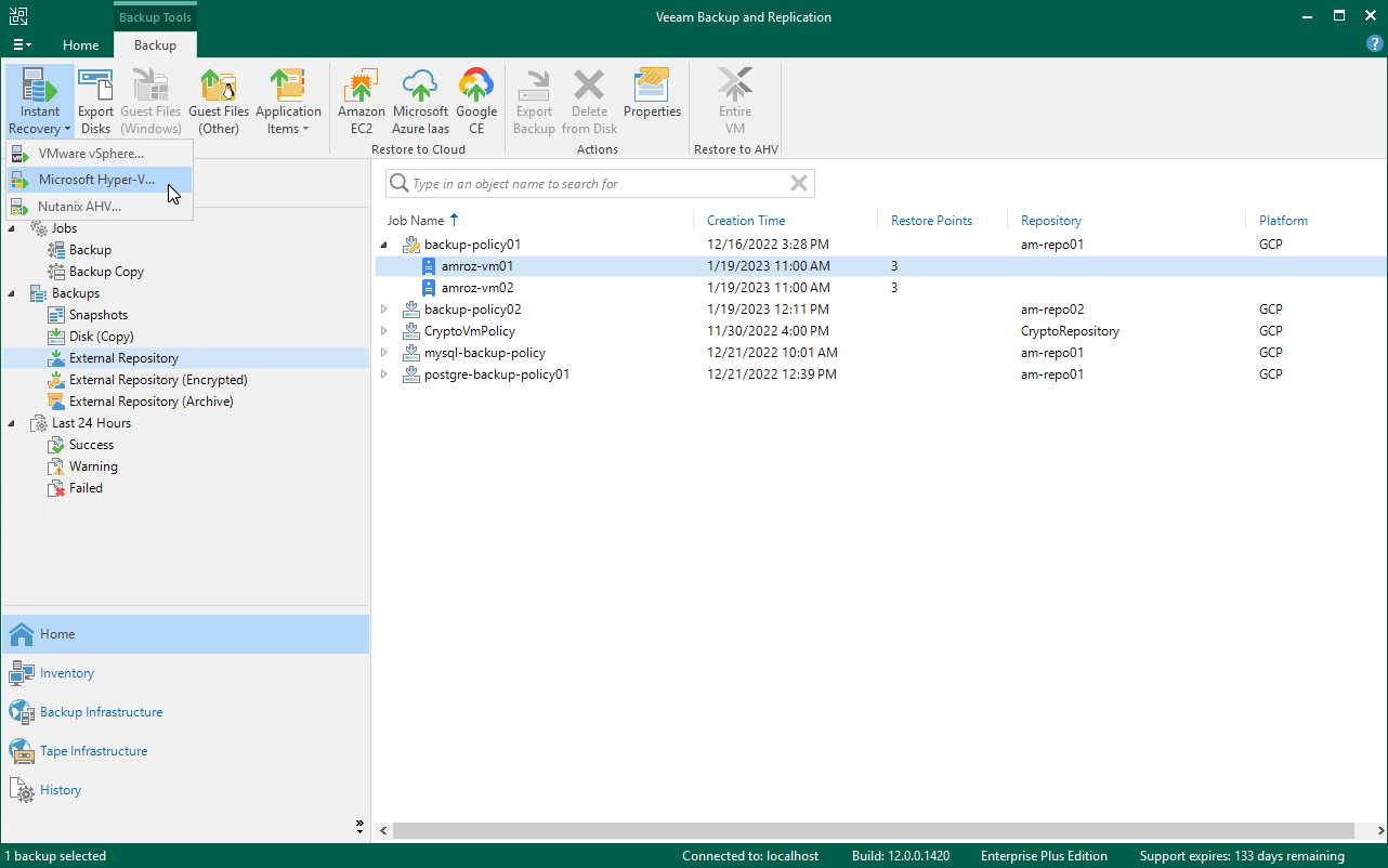 - Expand the backup policy that protects a VM instance that you want to recover, select the necessary instance and click Instant Recovery on the ribbon.