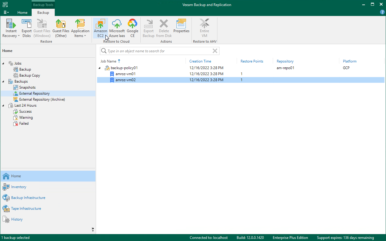 - Expand the backup policy that protects a VM instance that you want to restore, select the necessary instance and click Amazon EC2 on the ribbon.