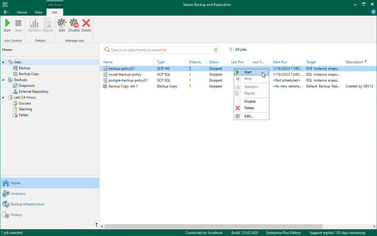 - Select the necessary backup policy, and click Start or Stop on the ribbon.