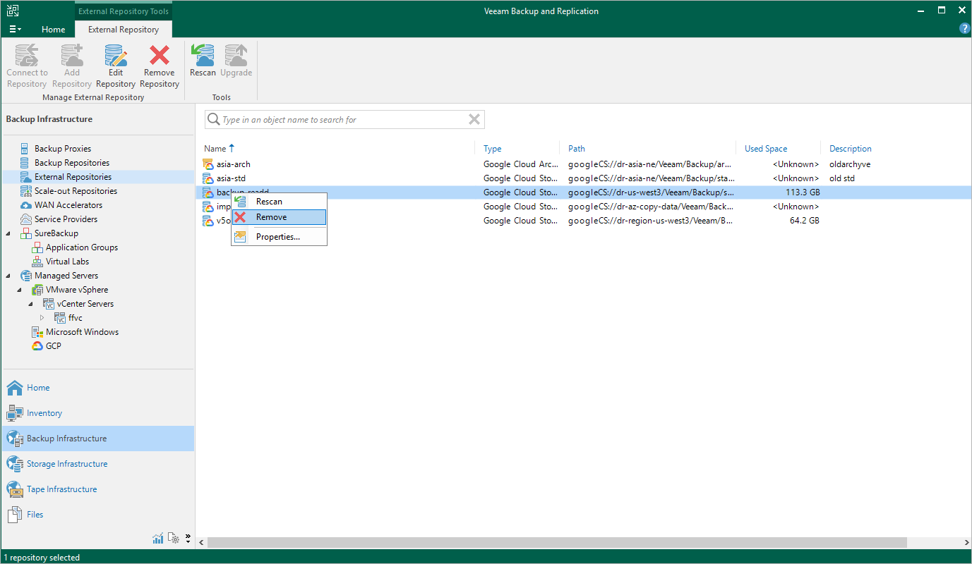 Google Cloud Plug-in for Veeam Backup & Replication allows you to permanently remove repositories from the backup infrastructure: