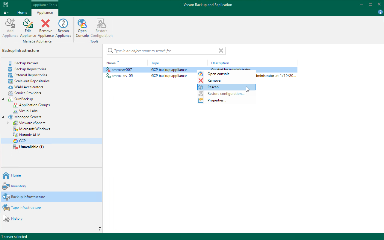 - Select the necessary backup appliance and click Rescan appliance on the ribbon.