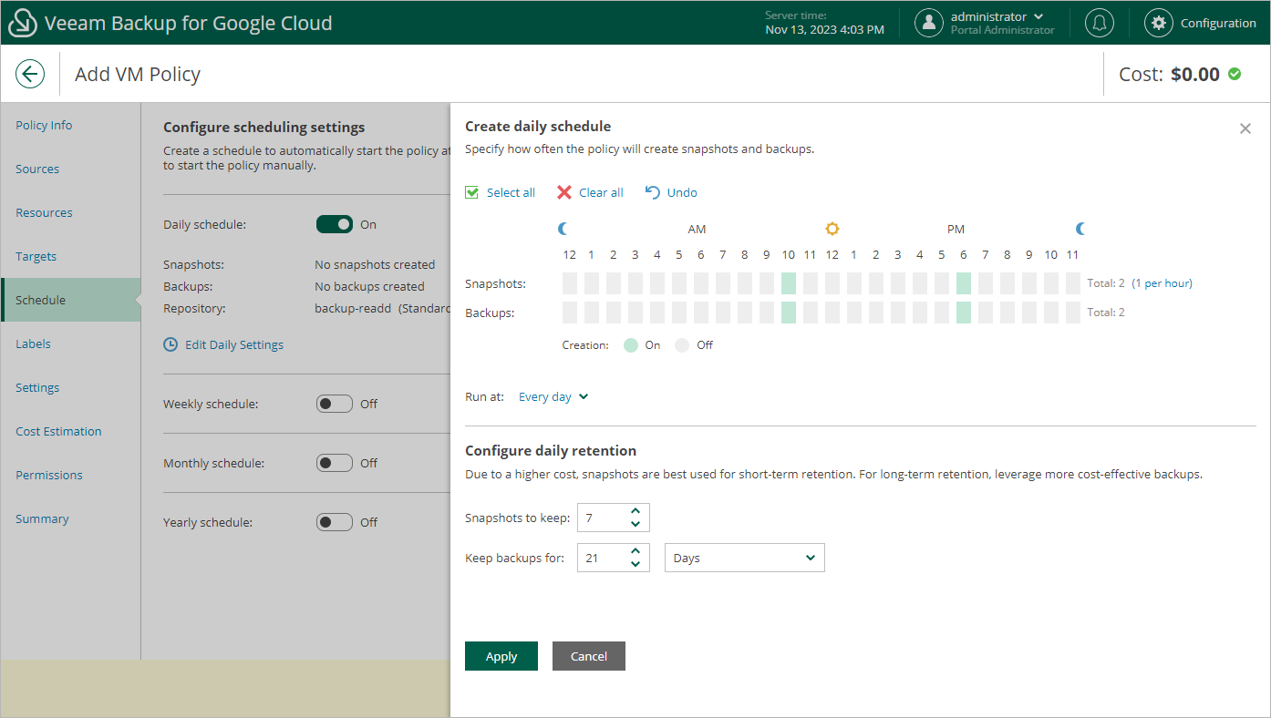 Veeam Backup for Google Cloud does not create image-level backups independently from cloud-native snapshots. That is why when you select hours for image-level backups, the same hours are automatically selected for cloud-native snapshots. To learn how Veeam Backup for Google Cloud performs backup, see VM Backup. |