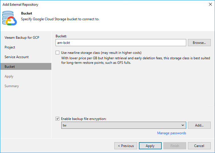 For a password to be displayed in the list of available passwords, it must be added to the backup infrastructure as described in the Veeam Backup & Replication User Guide, section Creating Passwords. If you have not added the necessary password beforehand, you can do it without closing the Bucket wizard. To do that, click either the Manage passwords link or the Add button, and specify the password and hint in the Password window.
