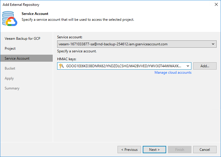 For an HMAC key to be displayed in the Credentials list, it must be added to the Cloud Credentials Manager as described in the Veeam Backup & Replication User Guide, section Google Cloud Accounts. If you have not added the necessary key to the Cloud Credentials Manager beforehand, you can do it without closing the Add External Repository wizard. To do that, click either the Manage accounts link or the Add button, and specify the HMAC key access ID and secret in the Credentials window.
