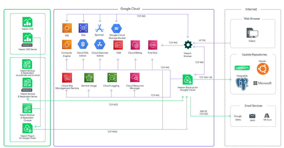 This is an archive version of the document. To get the most up-to-date information, see the current version. Solution Architecture The Veeam Backup for Google Cloud architecture includes the following components:Backup serverGoogle Cloud Plug-in for Veeam Backup & ReplicationBackup appliancesBackup repositoriesWorker instancesAdditional repositories and tape devicesGateway serversRelated TopicsPortsGoogle Cloud APIs