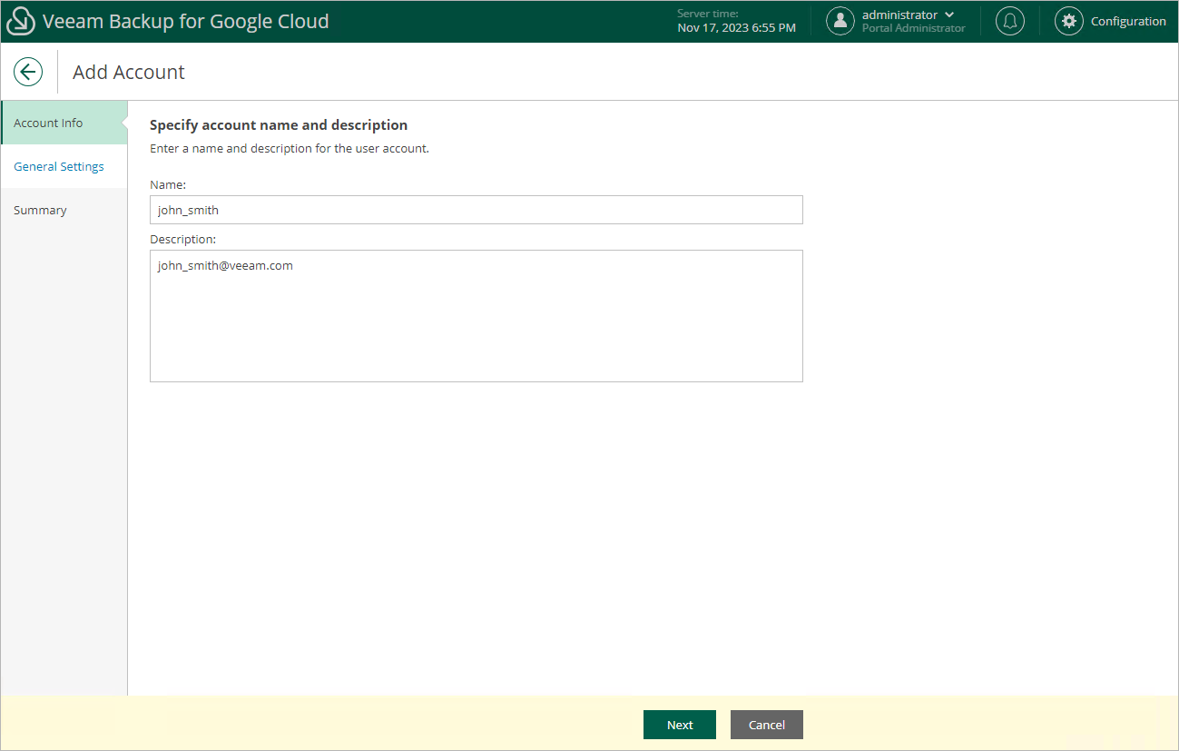 At the Account Info step of the wizard, use the Name and Description fields to enter a name for the new user account and to provide a description for future reference.
