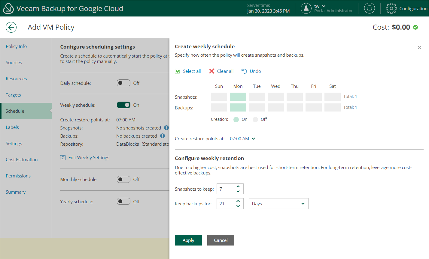 1. In the weekly scheduling settings, you select hours and days when backups will be created (for example, 7:00 AM, Monday), and specify a number of days for which Veeam Backup for Google Cloud will retain backups (for example, 21 days).