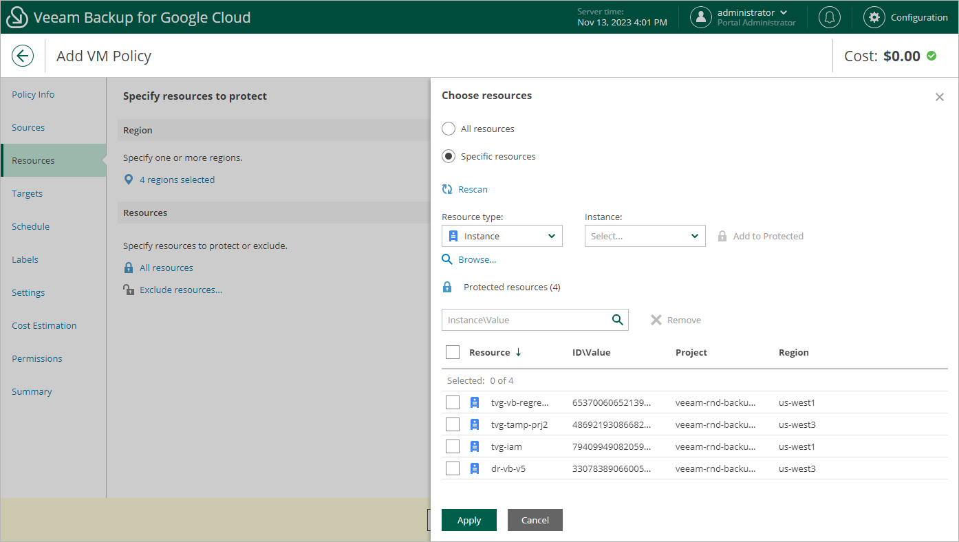 In the Resources section of the Resources step of the wizard, specify the backup scope — select VM instances that Veeam Backup for Google Cloud will back up: