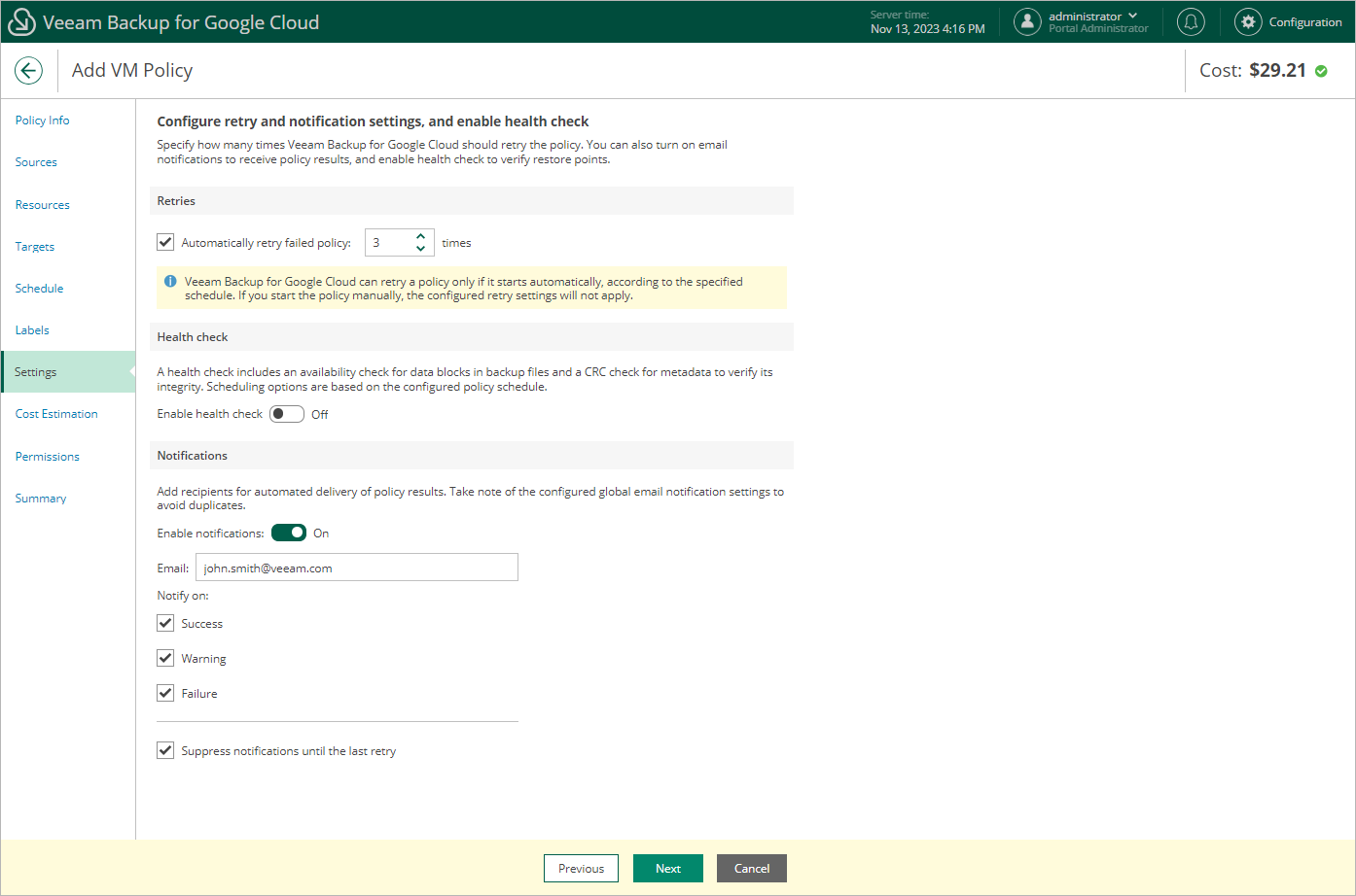To instruct Veeam Backup for Google Cloud to send email notifications for the backup policy, do the following: