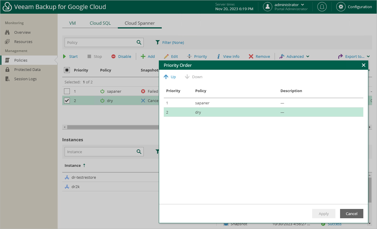 By default, Veeam Backup for Google Cloud runs backup policies in the order you create them. However, you can set the backup policy priority manually: