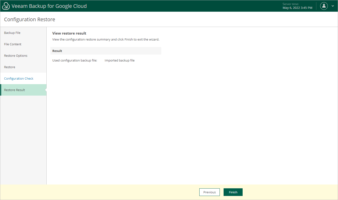 At the Restore Result step of the wizard, click Finish to finalize the process of configuration data restore.