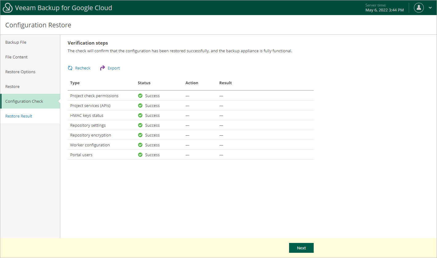 After the restore process is over, Veeam Backup for Google Cloud will run a number of verification checks to confirm that the configuration data has been restored successfully. At the Configuration Check step of the wizard, wait for the verification checks to complete and click Next.