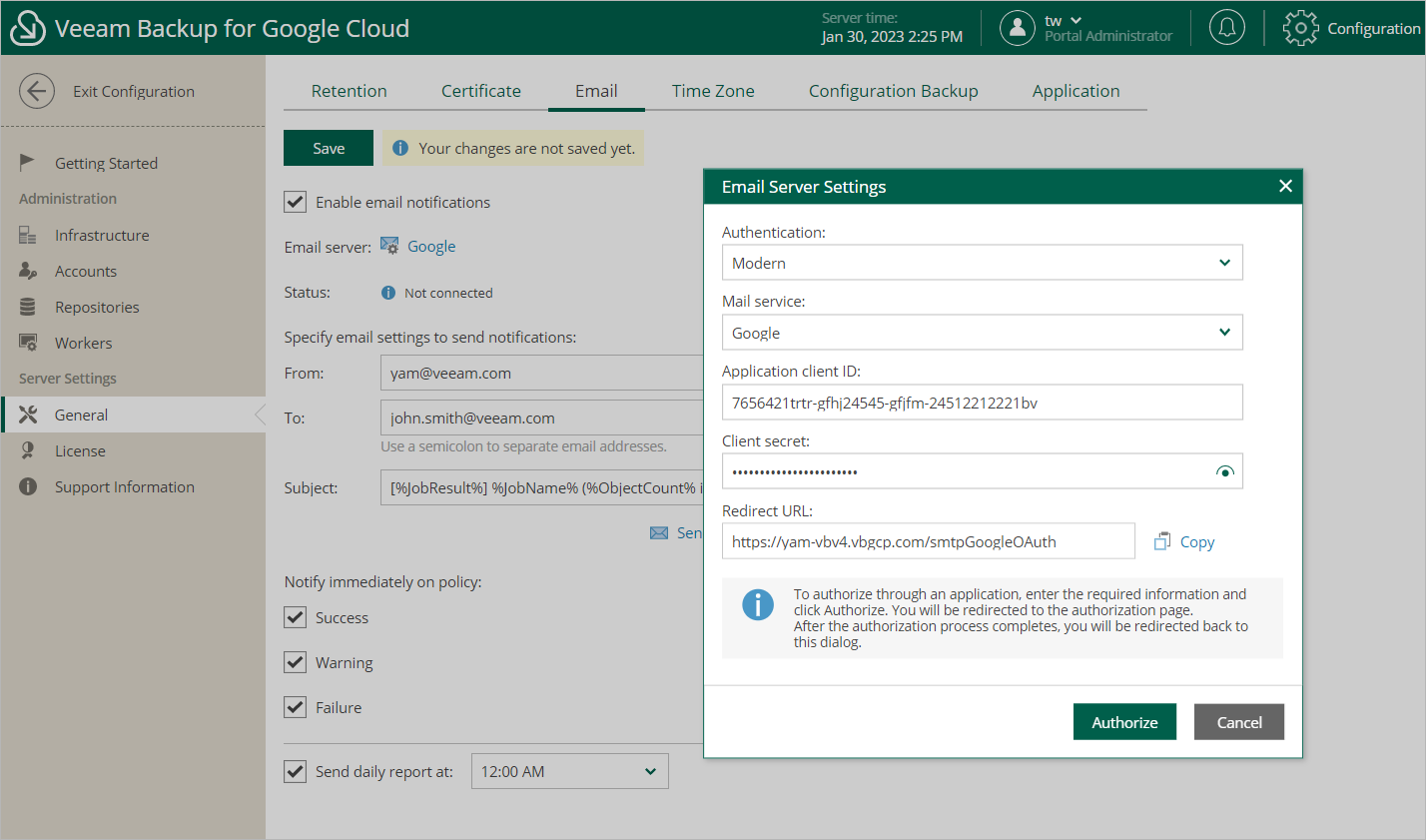 - Back to the Veeam Backup for Google Cloud Web UI, do the following in Email Server Settings window: