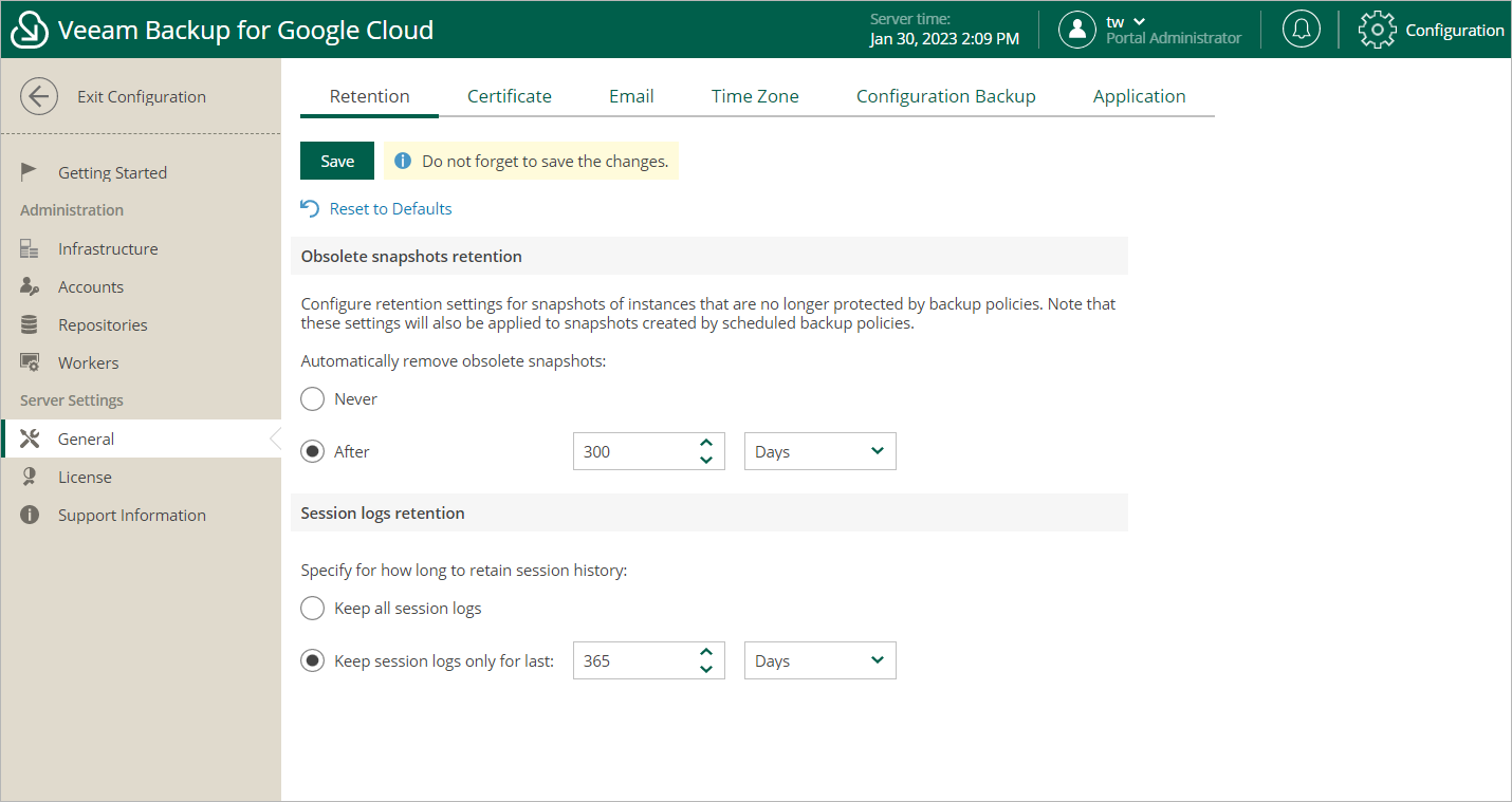 - Select the Keep all session logs option if you do not want Veeam Backup for Google Cloud to remove session records.