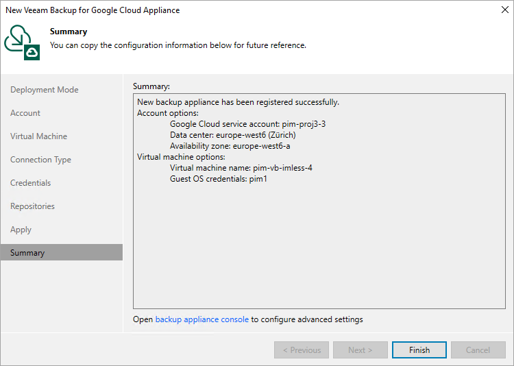 At the Summary step of the wizard, review summary information and click Finish. After the backup appliance is added to the backup infrastructure, you will be able configure its settings in the Veeam Backup for Google Cloud Web UI.