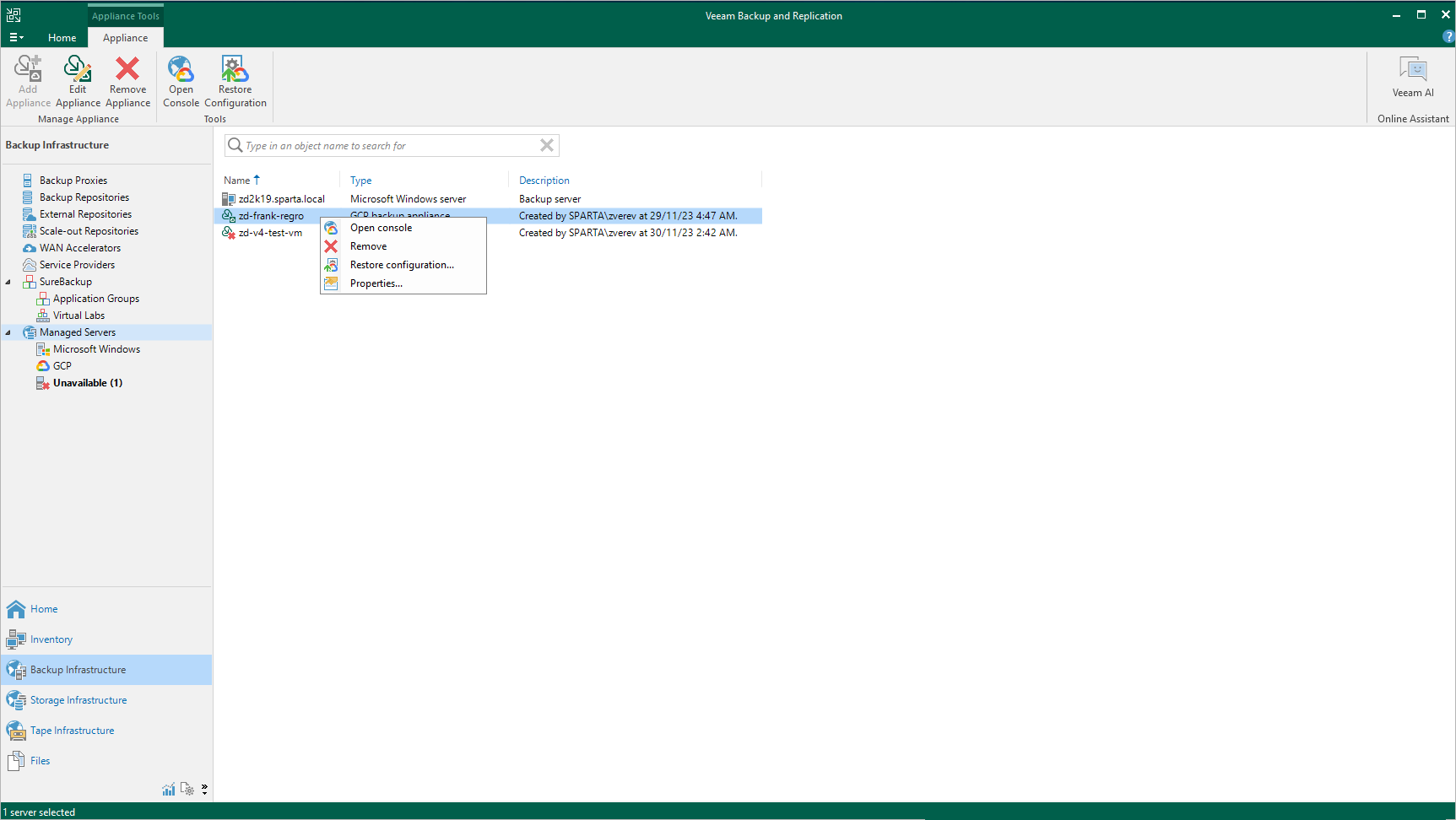 - Select a backup appliance that manages the necessary repository and click Edit Appliance on the ribbon.