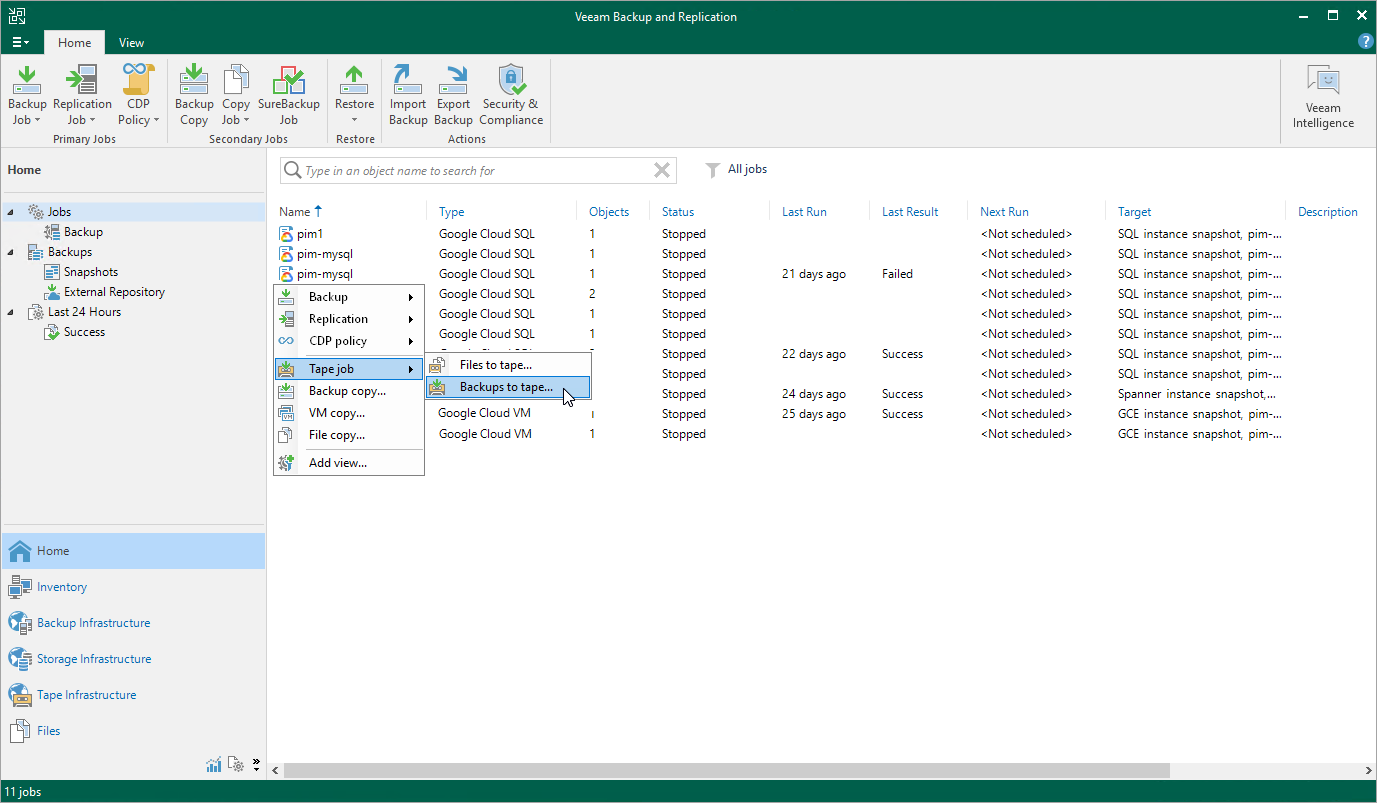 To copy VM instance backups to tapes, create a backup to tape job as described in the Veeam Backup & Replication User Guide, section Creating Backup to Tape Jobs.