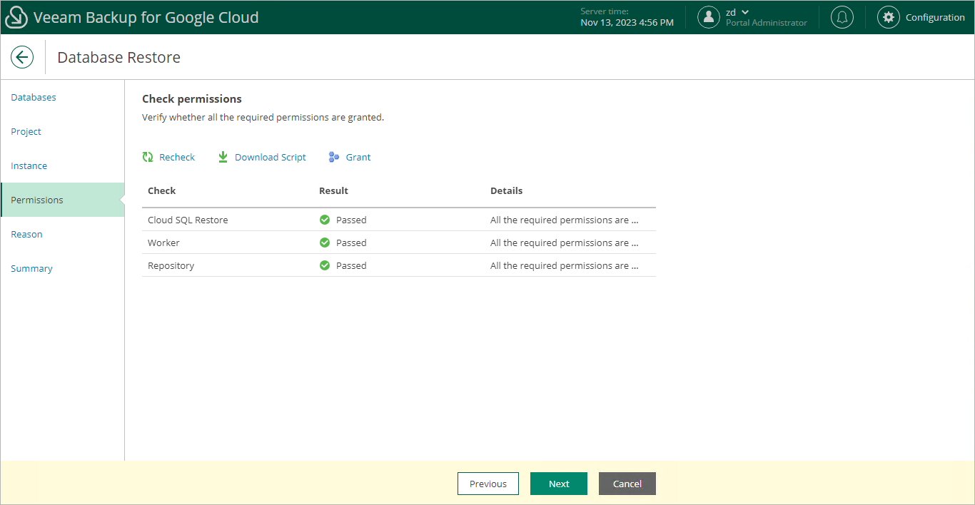 At the Permissions step of the wizard, Veeam Backup for Google Cloud will verify whether the specified service account has all the necessary permissions required to perform data recovery tasks for the selected project. For more information on the required permissions, see Service Account Permissions.