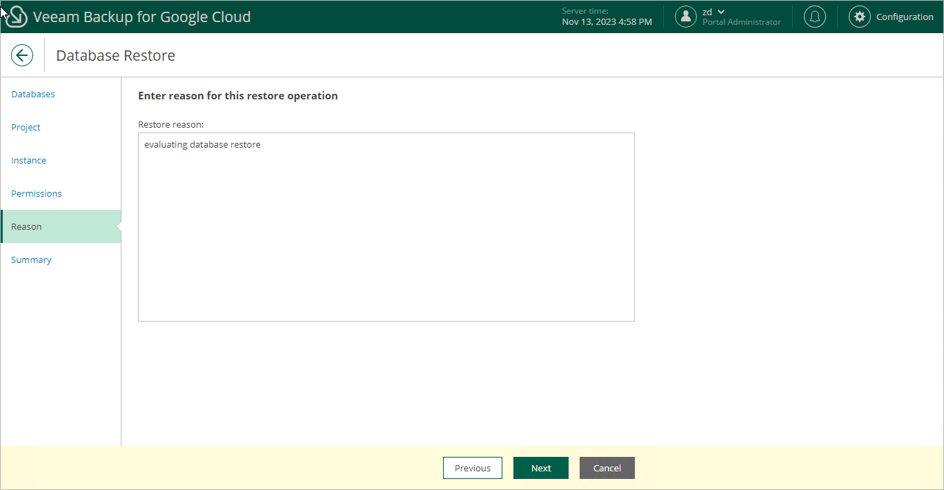 At the Reason step of the wizard, specify a reason for restoring the Cloud SQL databases. This information will be saved to the session history, and you will be able to reference it later.