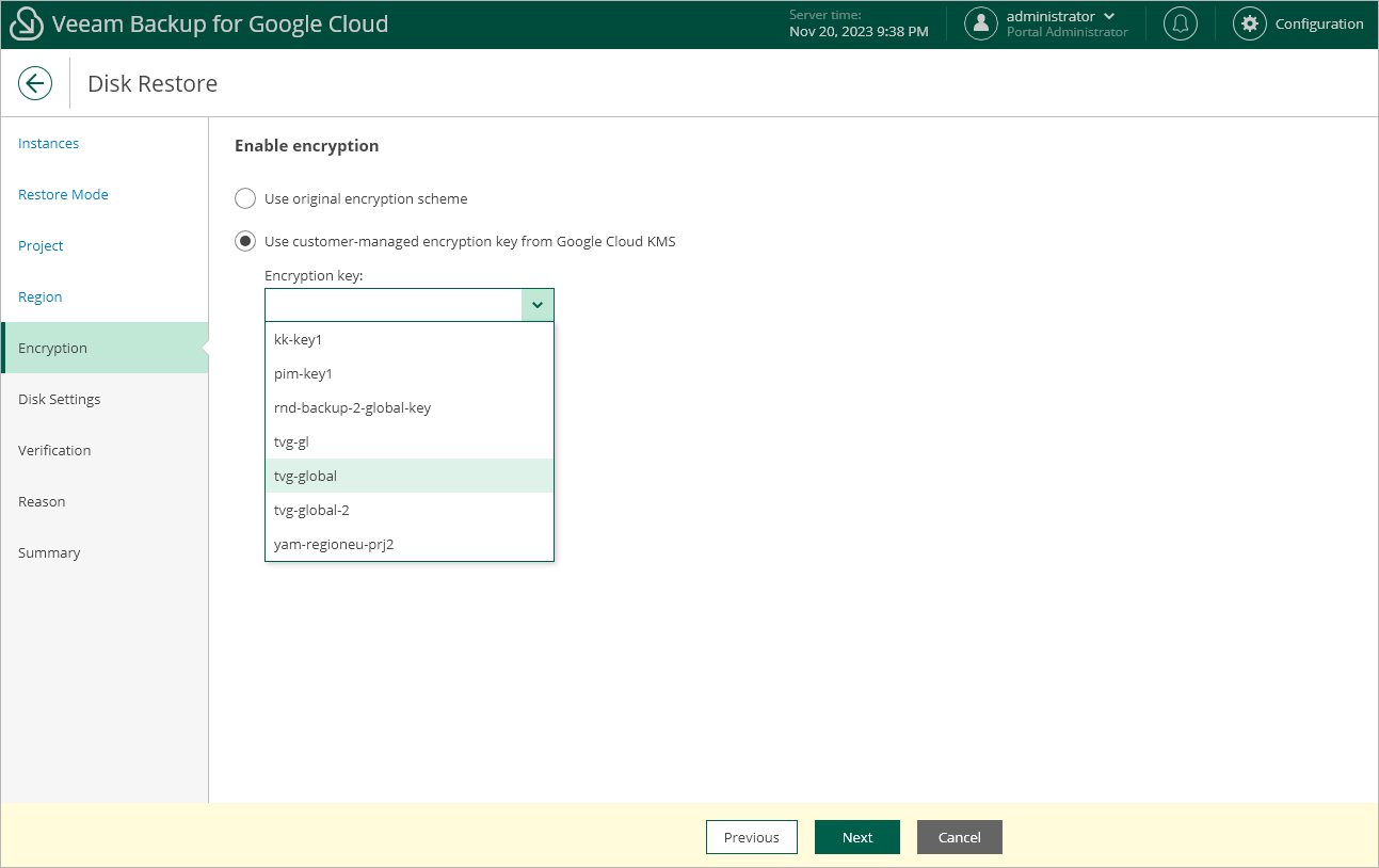 - If you want to encrypt the restored persistent disks with a Google Cloud KMS CMEK, select the Use customer-managed encryption key from Google Cloud KMS option and choose the necessary CMEK from the Encryption key drop-down list.