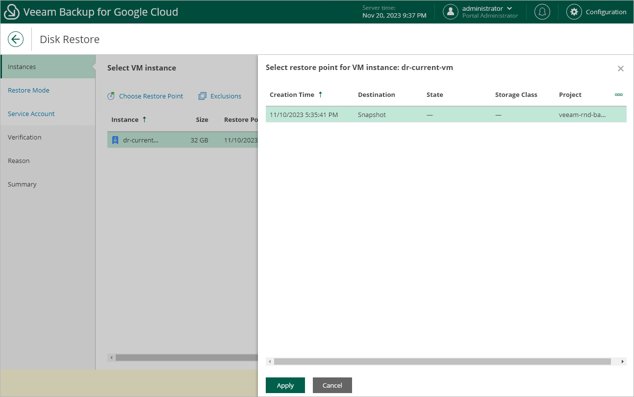 At the Instances step of the wizard, select a restore point that will be used to restore persistent disks of the selected VM instance. By default, Veeam Backup for Google Cloud uses the most recent valid restore point. However, you can restore the disks to an earlier state.