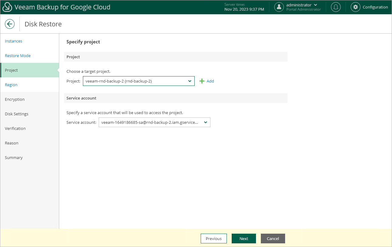 For a project to be displayed in the Project drop-down list, it must be added to Veeam Backup for Google Cloud as described in section Adding Projects and Folders. If you have not added the necessary project to Veeam Backup for Google Cloud beforehand, you can do it without closing the VM Instance Restore wizard. To do that, click Add and complete the Add Projects and Folders wizard.
