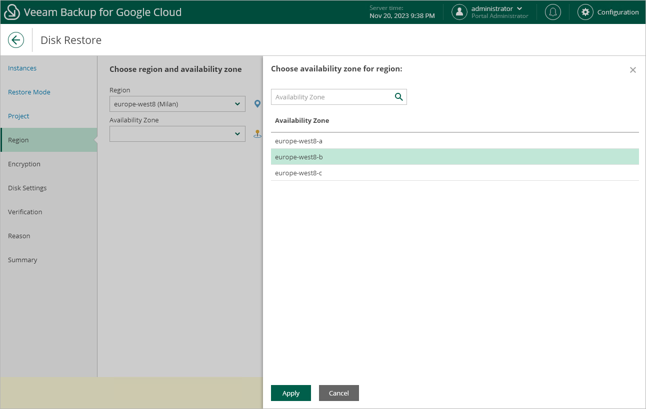 At the Region step of the wizard, select a region and an availability zone to which the restored persistent disks will be placed.