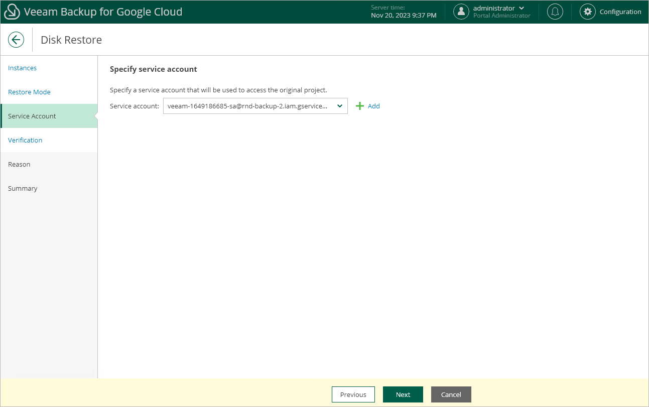 If you have not added the necessary service account to Veeam Backup for Google Cloud beforehand, you can do it without closing the VM Instance Restore wizard. To do that, click Add and complete the Add Service Account wizard.