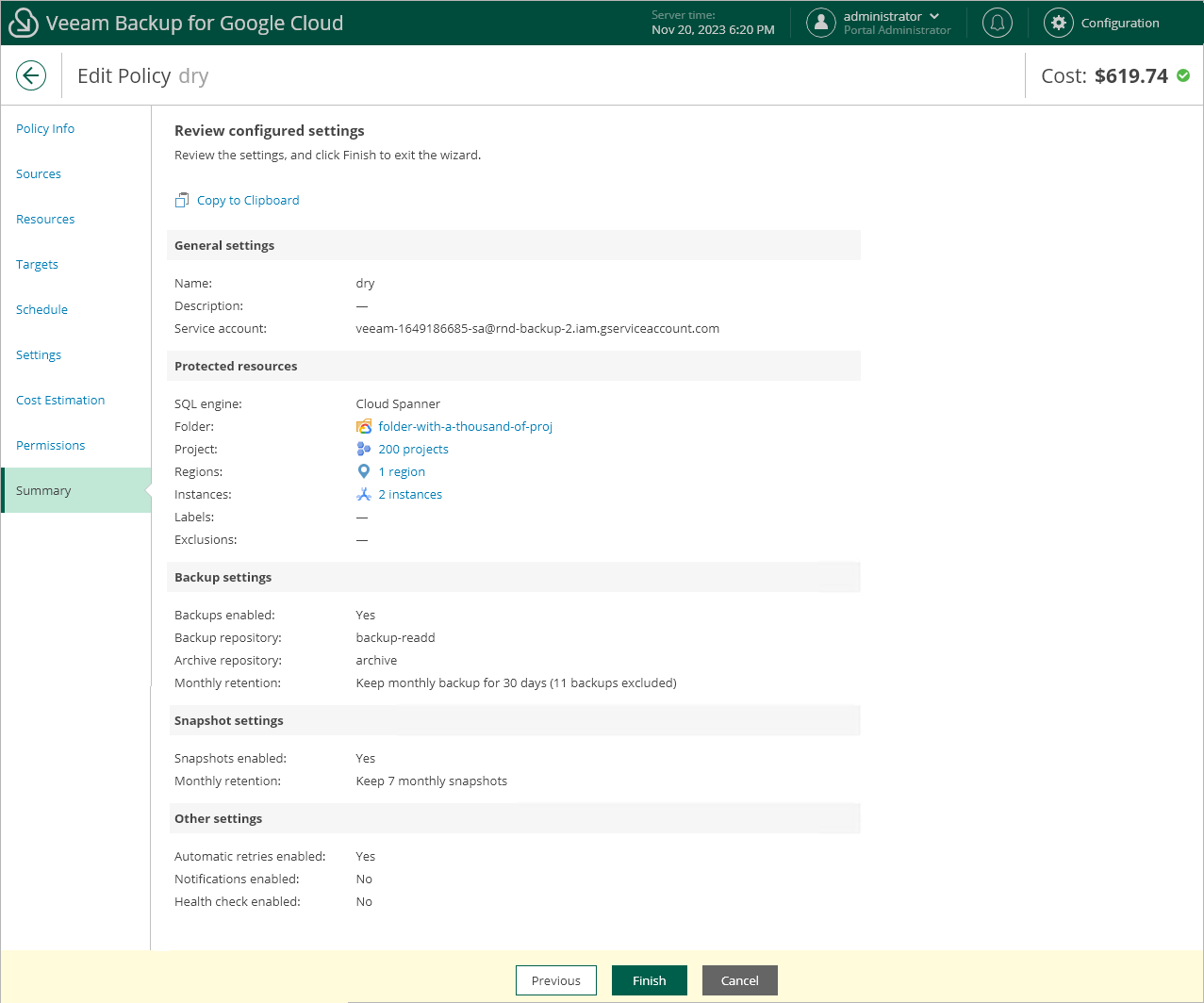 If you change the project, folder or service account, it is recommended that you check whether the selected service account has all the permissions required to perform data protection tasks in the specified entity. To do that, follow the instructions provided in section Performing VM Backup (step 10), Performing SQL Backup (step 10) or Performing Spanner Backup (step 10). |