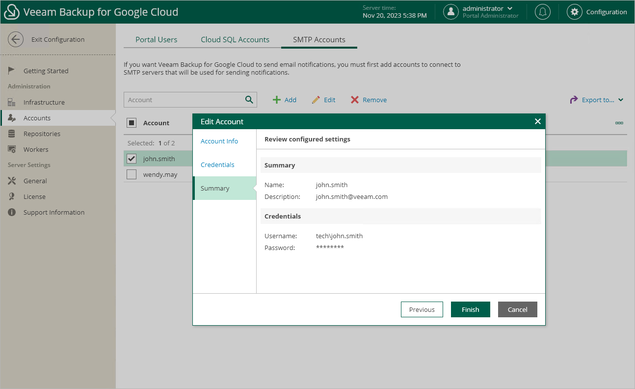 - To specify credentials of another user account to be used to authenticate against the SMTP server, follow the instructions provided in section Adding SMTP Accounts (step 3).
