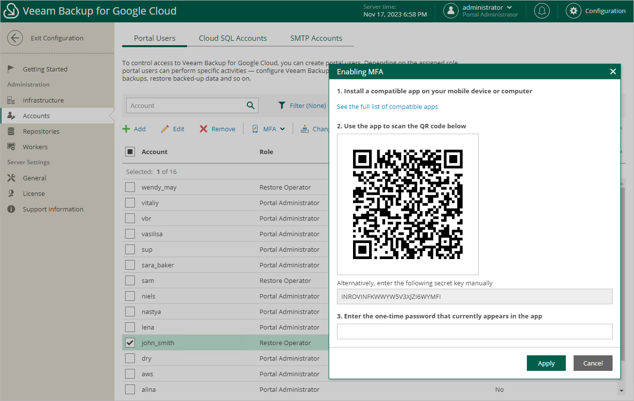 Only Google Authenticator is fully supported by Veeam Backup for Google Cloud. |