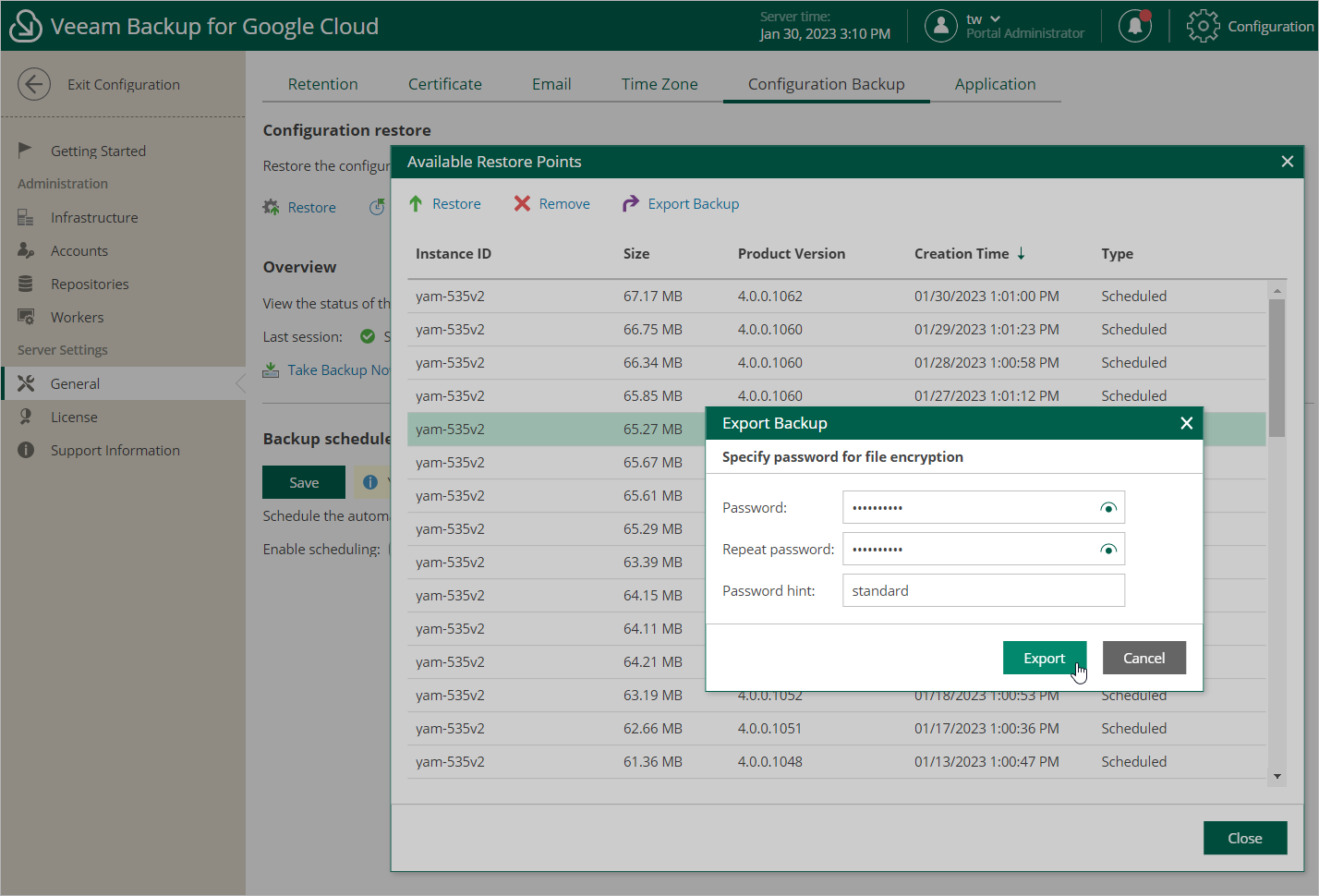 Once Veeam Backup for Google Cloud creates a successful configuration backup, you can export the configuration backup file and use it to restore configuration data on another backup appliance.
