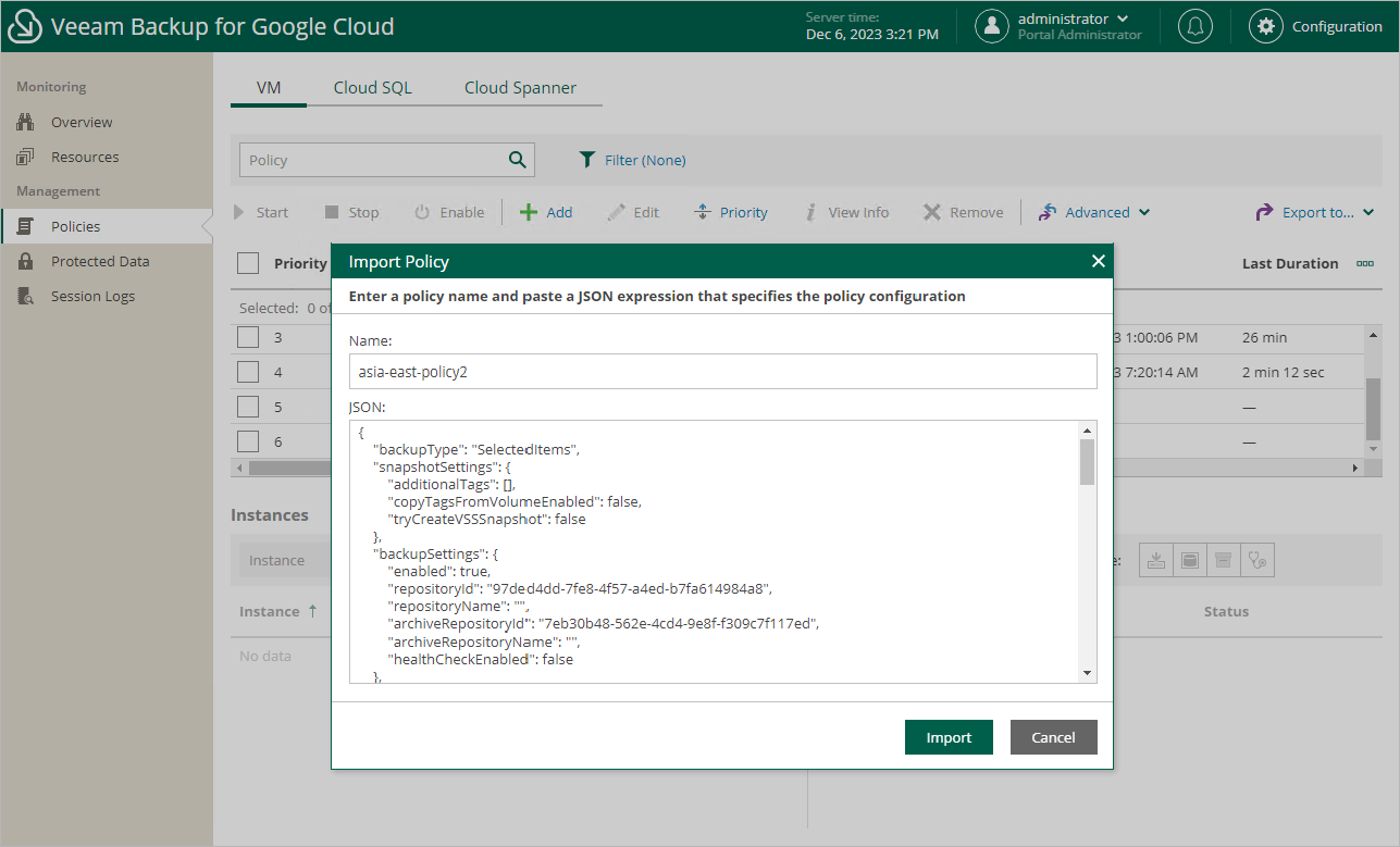 - In the Import Policy window, specify a name for the imported backup policy, paste the content of the necessary .JSON file, and click Import.