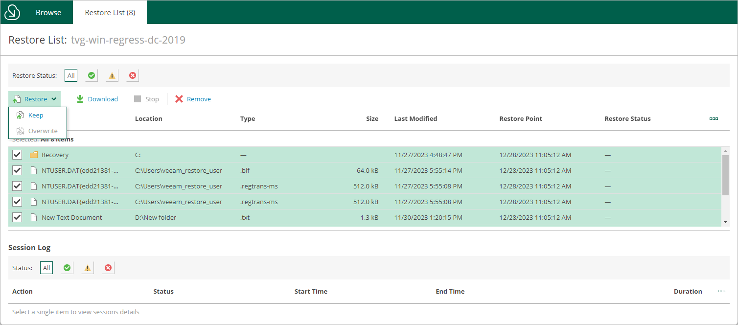 - On the Restore List tab, review the list of items to recover, select check boxes next to the items and do the following: